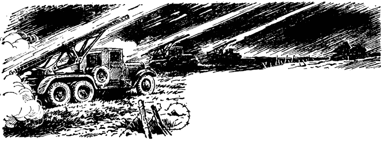 ГВАРДЕЙСКАЯ «КАТЮША»Испытания нового оружия произвели сильнейшее впечатление даже на видавших виды военачальников. Действительно, окутанные дымом и пламенем боевые машины зa несколько секунд выпускали по шестнадцать реактивных 132-мм снарядов, а там, где только что виднелись мишени, уже крутились огненные смерчи, заливая далекий горизонт багровым заревом.