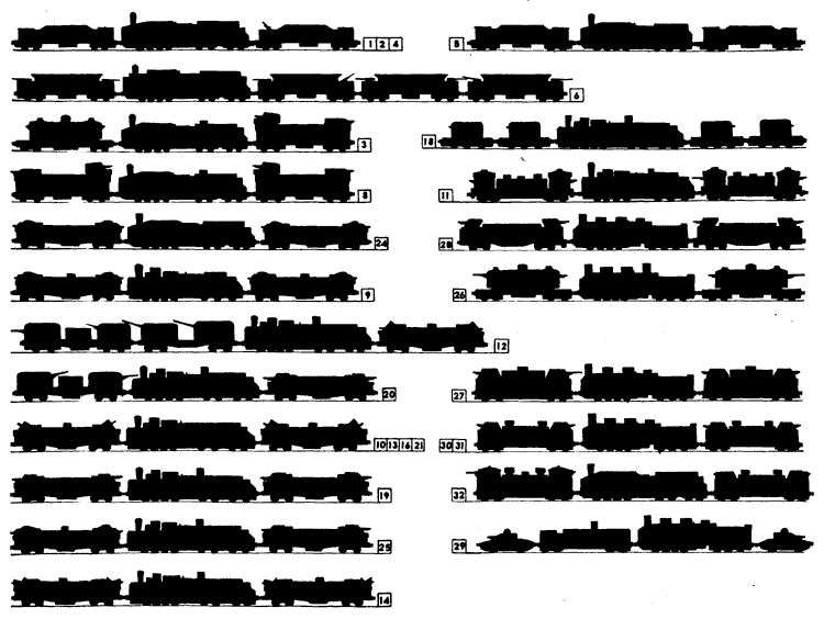 Схема формирования бронепоездов: 1 - зенитный бронепоезд ижорского завода, 2-4-й Петроградский (44 имени Володарского), 3-№ 41 “Славный вождь Красной Армии Егоров”, 4-3-й Петроградский “Мститель”, 5-№ 67 “Волгарь”, б - 2-й Петроградский, 8 - № 87 “III Интернационал”, 9-№ 14, 10-№ 10 имени Розы Люксембург, 11-№ 17 “Смерть или победа”, 12 - № 85, 13 - “Имени тов. Л. Троцкого”, 14-№ 64 “Центробронь”, 16-№ 3 “Власть Советам”, 18 - № 4 “Коммунар”, 19-№ 20, 20--№ 71 имени-Володарского (“Ахтырец”), 21-№ 7 “Стенька Разин”, 24-№ 45 имени III Интернационала, 25 - № 100 “Свободная Россия”, 26-№ 98 “Советская Россия”, 27 - № 27 “Буря”, 28 - № 89 имени Л. Д. Троцкого, 29 - № 96 “Красный ураган”, 30 - № 60 имени Карла Либкнехта, 31-“Коммунист” (Коростеньский район), 32-№ 34А “Красноармеец”, 33 - № 2 “Победа или смерть” первоначального формирования, 35 - Минский коммунистический имени Ленина, 36 - № 6 “Путиловцы” имени тов. Ленина первоначального формирования, 36а - № 6 “Путиловцы” последующего формирования (бронеплощадки и тендер - см. “М-К” № 1 за 1990 г.), 37 - “Тов. Ленин”. Бронепоезд № 36 имени В. И. Ленина аналогичен бронепоезду № 20 (см. схему в “М-К” № 3 за 1990 г.).