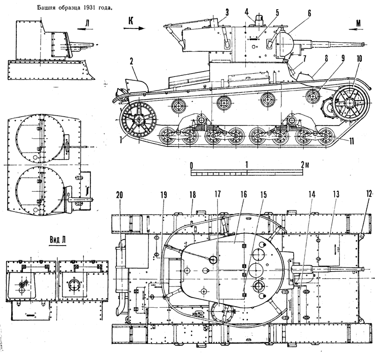 Рис. 1. Легкий танк Т-26 образца 1933 года: 1 направляющее колесо, 2 воздухозаборник, 3- ввод антенны, 4 смотровой прибор, 5 смотровая щель, 6 маска пушки, 7 звуковой сигнал, 8 фара, 9 поддерживающий ролик, 10 ведущее колесо, 11 опорная тележка с катками, 12 буксирная скоба, 13 люк трансмиссии, 14 люк механика-водителя, 15 люк башенного стрелка, 16 люк командира, 17 люк над воздухоочистителем, 18 крыло, 19 люки моторного отделения, 20 глушитель. |