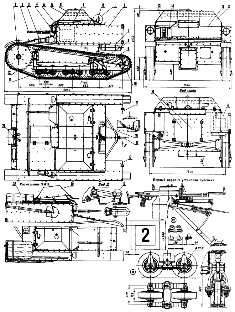 Самоходно-артиллерийские установки на базе Т-27: 1 — сигнал, 2 — пушка Гочкиса, 3 - прицел, 4 — механизм натяжения гусеницы, 5, 6 — поддерживающие катки, 7 — смотровая щель механика-водителя, 8 — пулемет ДТ, 9 — выхлопная труба, 10 — броневой кожух системы охлаждения двигателя, 11 — прицеп, 12 - 76-мм динамореактивцая пушка.