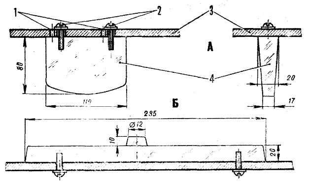 Б - ванночка «замка» па палубе: 1 - матрица, 2 - метка ЛНШ, 3 - пенопласт 3Х10 мм (удалить после отверждения смолы), 4 - оболочка палубы.