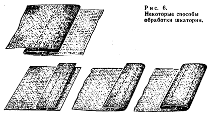 После того как полотнища будут сшиты, их необходимо вновь уложить на плаз и подвернуть шкаторины точно по линиям чертежа. Для предотвращения смещения кроя во время этой ответственной операции его нужно прикрепить к плазу канцелярскими кнопками или хотя бы прижать тяжелыми предметами. Подогнутая шкаторина разглаживается и обрезается так, чтобы оставалась ткань на подгиб шириной 15-20 мм. По кромке паруса (если он сшит из легкой ткани) можно пришить усиливающую ленту. Работа существенно упрощается, если заднюю шкаторину выполнить ломаной, образованной прямыми линиями, соединяющими концы лат.