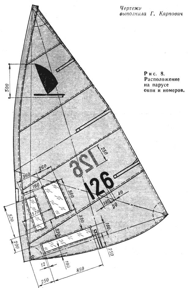 При раскрое изделия, предназначенного для установки на гибкую мачту, надо предусмотреть дополнительный запас ткани, соответствующий кривизне мачты под нагрузкой. Серповидность же передней шкаторины образуется складыванием стрел прогиба кривых а и в (рис. 1). Теперь становится понятным, почему шить парус следует на строго определенную мачту.