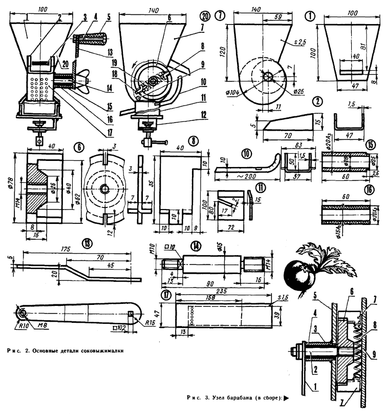 Рис. 2. Основные детали соковыжималки: 1 передняя стенка бункера, 2 лоток для жома, 3 окно выхода жома, 4 вал, 5 ручка, 6 барабан, 7,20 боковые стенки бункера (стенка 20 с отверстием), 8 нож (утоплен), 9 помидор, 10 лоток для сока, 11 стойка, 12 струбцина, 13 шатун ручки, 14 ось, 15 корпус подшипника, 16 подшипник (фторопластовая втулка), 17 сетка (или перфорированная полоса с отверстиями Ø 1,5 мм), 18 нож (в выдвинутом состоянии), 19 пружина ножей.