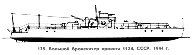 129. Большой бронекатер, проект 1124, СССР, 1944 г. Модификация бронекатера проекта 1124 с башнями танка Т-34. Водоизмещение 49,3 т, мощность двух бензиновых моторов 1700 л. с., скорость хода 21 узел. Длина наибольшая 25,3 м, ширина 4,06 м, среднее углубление 0,81 м. Бронирование цитадели 5-8 мм. Вооружение: два 76-мм орудия в башнях танка Т-34, два 12,7-мм пулемета, один 37-мм зенитный автомат.