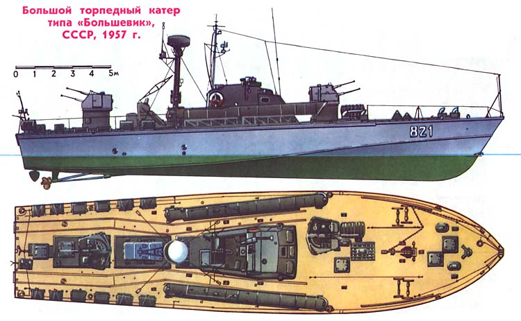 Дальнейшим развитием этого типа стали катера серии “Дарк”, строившиеся на английских верфях в 1952— 1956 годах. В торпедном варианте число труб на них было увеличено до четырех. Одновременно с легким англичане разрабатывали и тип тяжелого торпедного катера “Болд”. На таких 37-метровых кораблях водоизмещением 130—140 т впервые были применены газотурбинные установки: две турбины суммарной мощностью 9000 л. с. и два дизеля мощностью 5000 л. с. сообщали катеру скорость 45—43 узла.
