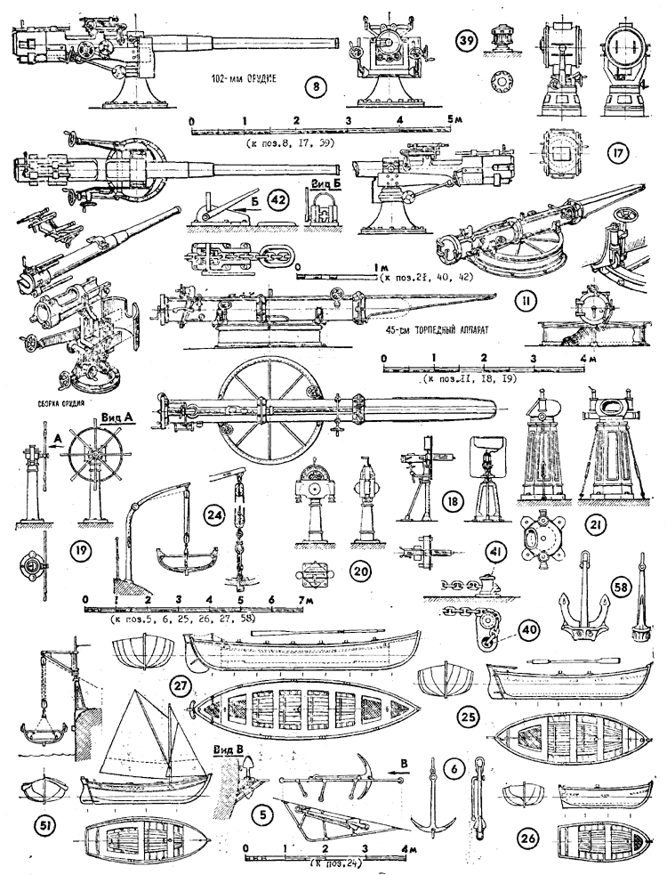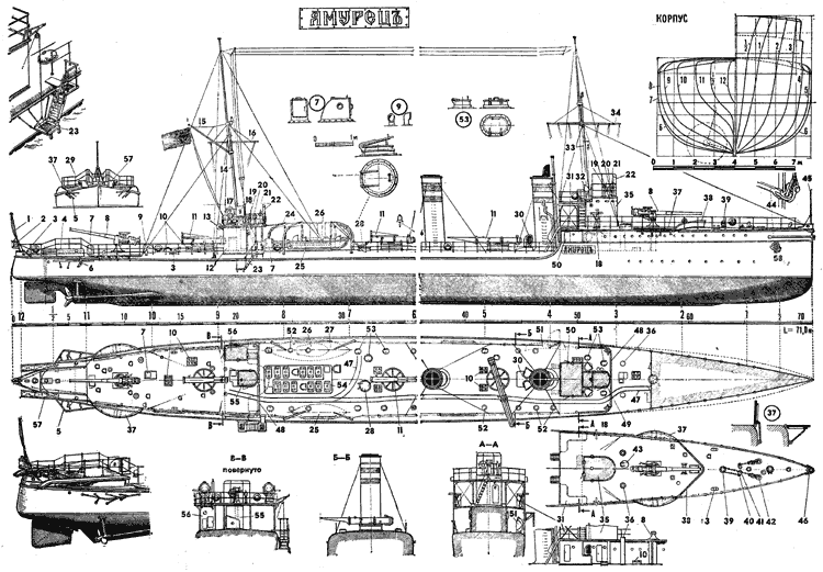 Эскадренный миноносец «Амурец»: 1 - флагшток, 2 - гакобортный огонь, 3 - кнехты. 4 - площадка над румпелем, 5 - ограждение винтов, 6 - верп, 7 - сходной люк 8 - 102-мм орудие, 9 - сентилятор машинного отделения, 10 - световые люки, 11 - 450-мм торпедный аппарат, 12 - кормовой мостик, 13 - тросовая вьюшка, 14 - грот-мачта, 15 - гафель, 16 - грота-реи, 17 - 750-мм прожектор, 18 - пулемет, 19 - штурвал, 20 - машинный телеграф, 21 - компас, 22 - парусиновый обвес, 23 - забортный трап, 24 - шлюп-баяка, 25 - четырехвесельный ял, 20 - тузик, 27 - шестивесельный вельбот, 28 - головка центробежного вентилятора, 29 - леерная стойка, 30 - дефлектор котельного отделения, 31 - коечные сетки, 32 - штурманский стол. 33 - фок-мачта, 34 - фока-реи, 35 - боевая рубка, 36 - элеватор 102-мм снарядов, 37 - откидная площадка, 38 - волнолом, 39 - шпиль. 40 - клюз цепного ящика. 41 - роульс якорной цепи, 42 - палубный клюз, 43 - круглый люк, 44 - брага, 45 - гюйс-шток, 46 - кранец, 47 - рельсы для перезарядки торпедных аппаратов, 48 - штуртрос, 49 - носовая рубка парового штурвала, 50 - камбуз, 51 - парусиновая шлюпка Кебке, 52 - горловина угольной ямы, 53 - овальные люки, 54 - световой люк и дефлекторы машинного, отделения, 55 - кормовая рубка парового штурвала; 56 - радиорубка, 57 - кормовые минные скаты, 58 - якорь Холла. |
