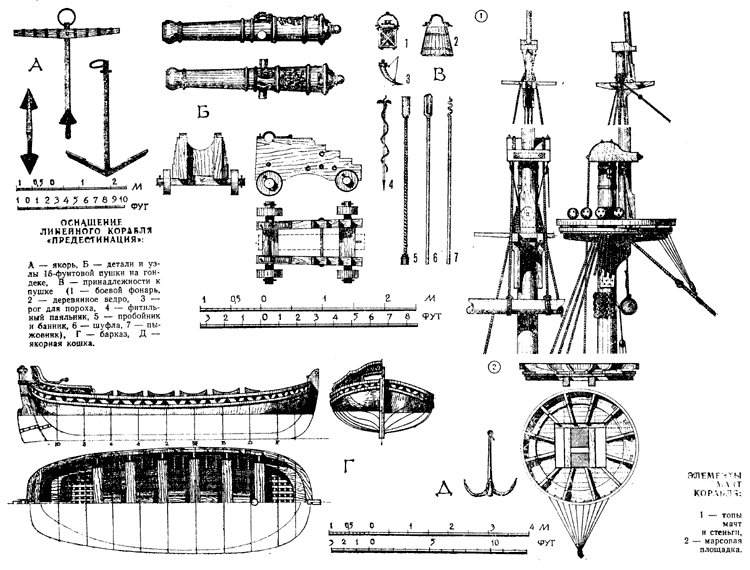 ОСНАЩЕНИЕ ЛИНЕЙНОГО КОРАБЛЯ «ПРЕДЕСТИНАЦИЯ»: А - якорь, Б - детали и узлы 16-фунтовой пушки на гон-деке, В - принадлежности к пушке (1 - боевой фонарь, 2 - деревянное ведро, 3 - рог для пороха, 4 - фитильный паяльник, 5 - пробойник и банник, 6 - шуфла, 7 - пыжовник), Г - барказ, Д - якорная кошка.