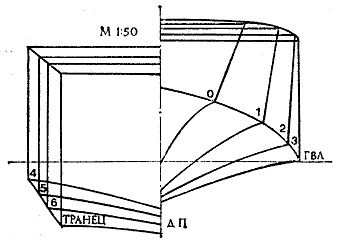 Корпус модели катера «Комсомолец» проще всего выполнить из целого бруска мягкого дерева (липа, осина или тополь) без трещин и сквозных сучков. Проведя линию диаметральной плоскости ДП), брусок разбивают на шпации и вычерчивают контур палубы. После обработки рубанком по контуру палубы вычерчивается форштевень и из фанеры вырезается транец. Его смазывают клеем и прибивают гвоздями к кормовой части.