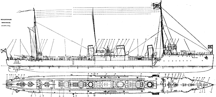 Чертежи эскадренного миноносца «Самсон» подготовлены капитаном 2-го ранга В. НАУМЕНКОВЫМ по модели, хранящейся в Центральном ордена Красной Звезды военно-морском музее (Ленинград).