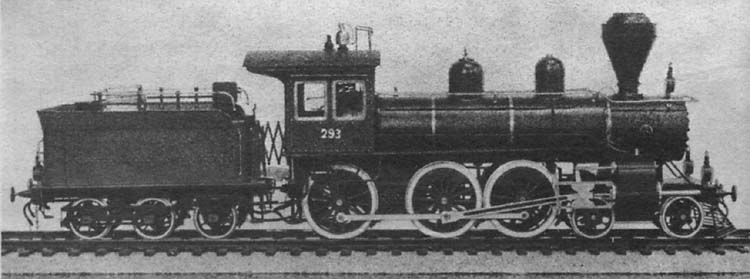 В зеленый цвет - сухопарник, песочницу, будку машиниста, наружные стенки тендера, колеса. Буферный брус паровоза и тендера в промежутке между буферами - красные. Предохранительные клапаны сухопарника и цилиндров, свисток, окантовка стекол будки машиниста, краны, корпуса манометров в будке, цифры номеров, предохранители паровоздушного насоса, колокол, стяжные кольца котла - цвета латуни. Стены будки машиниста с внутренней стороны от потолка до нижнего обреза окон белого цвета, а ниже (до пола) зеленого. Сиденья машиниста и помощника - коричневые. Все поручни на паровозе никелированные. При желании модель 293-го можно сделать в одном из масштабов, принятых для действующих модельных дорог, например, 1:87. Для этого необходимо данный чертеж уменьшить в два раза. Мотор, шестерни для редуктора, сцепки, колеса малого диаметра используются от моделей подвижного состава фирмы «Рikо». При изготовлении модели в этом масштабе нужно учесть особенности вписывания ее в малые радиусы путей. Так, рама паровоза делается несколько уже, чтобы колеса имели больший поперечный разбег, особенно крайние оси больших колес. Расстояние между тендером и паровозом нужно увеличить. Для хорошего хода модели токосъемники желательно изготовить как на паровозные колеса, так и на тендерные, а все пустоты заполнить грузом. Это обеспечит сцепление колес с рельсами, и паровоз будет водить за собой состав с вагонами. Небольшая проточка на поверхности катания одного из ведущих колес с надетым на него резиновым кольцом еще больше увеличит тяговые возможности паровоза.